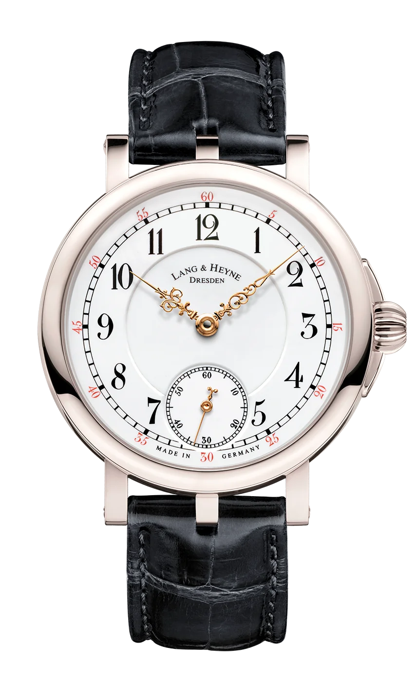 The case design, hands, and dial are the defining features of Friedrich August I. It exudes a classic and noble aesthetic, reminiscent of fine pocket watches from the 1900s. Delicately chiseled Louis XV hands, crafted and engraved in gold, or elegantly simple pear-shaped hands, reveal their full beauty on the three-part white enamel dial.
