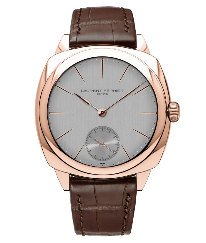 Intended to assert a bolder presence on the wrist than the Classic case, this cushion-shape Square case in solid red gold still reflects the pure, restrained LAURENT FERRIER style. The Square Micro-Rotor Silver with its silver-toned dial adorned with a vertical satin-brushed finish is punctuated by a small seconds subdial at 6 o’clock for a minimalist look. The finishes reflect the high standards of the finest watchmaking traditions to offer a perfect setting for the natural escapement.