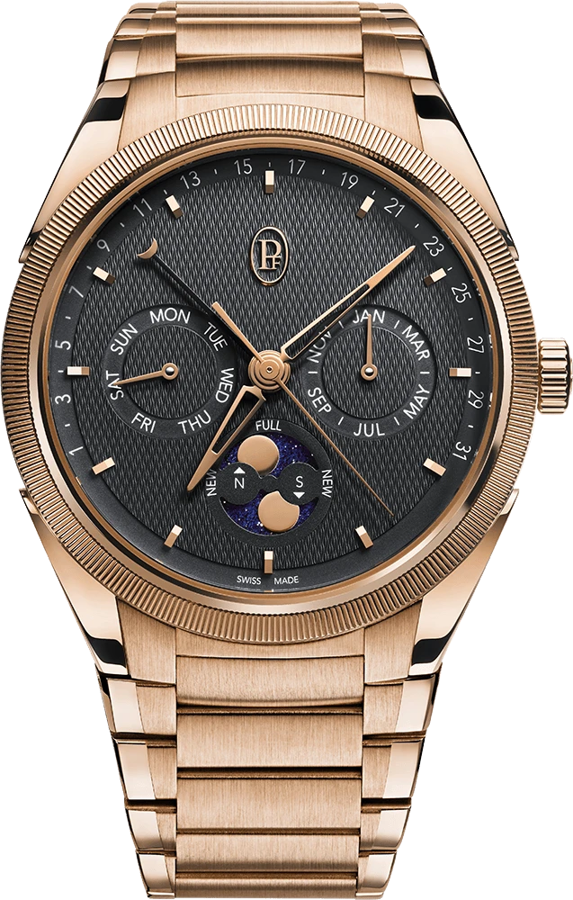 The Tonda PF Gregorian Annual Calendar’s 42mm case houses one of Haute Horlogerie’s most poetic complications: calibre PF339 displays retrograde date, day of the week, month and a 122-year moon phase in both hemispheres.