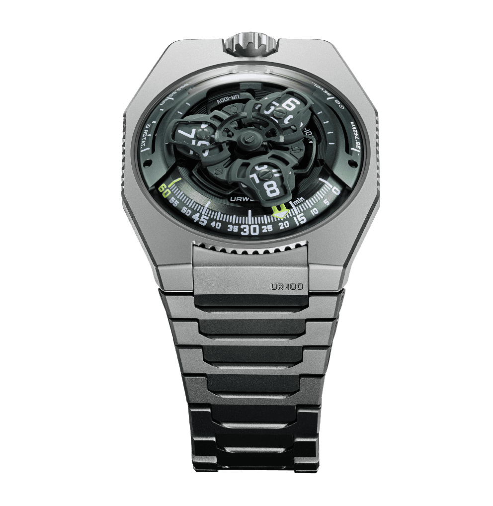 The UR-100V takes us on a journey through both time and space, merging two concepts at the very core of URWERK. The UR-100V SpaceTime features URWERK’s iconic satellite display, differing in one significant way. After minute pointers on the hour satellites disappear, they pass between subsidiary